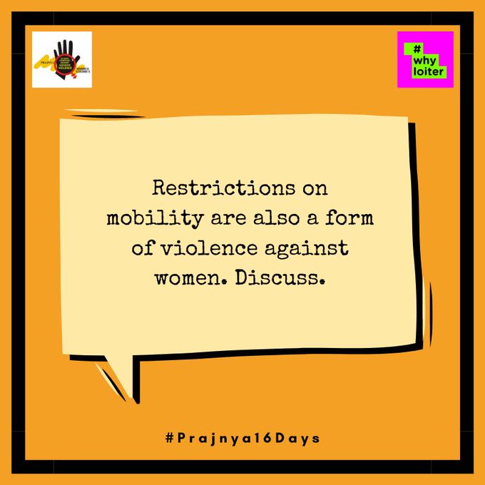 Hi everyone, this is @whyloiter and @samjourno123- we are taking over the @prajnya handle this evening in order to have a great discussion with you all on women, public space, citizenship, pleasure, violence .... #prajnya16days #nosgbv #WhyLoiter (29/11/2020, 06:06 PM)